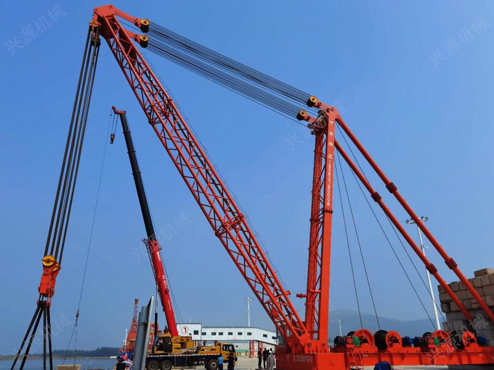 桅桿式起重機桅桿式起重機,固定安裝的起重機,一般用于港口碼頭桅桿式起重機又稱為拔桿或把桿,是最簡單的起重設(shè)備。一般用木材或鋼材制作。這類起重機具有制作簡單、裝拆方便,起重量大,受施工場地限制小的特點。 特別是吊裝大型構(gòu)件而又缺少大型起重機械時,這類起重設(shè)備更顯它的優(yōu)越性。但這類起重機需設(shè)較多的纜風(fēng)繩,移動困難。另外,其起重半徑小,靈活性差。因此,桅桿式起重機一般多用于構(gòu)件較重、吊裝工程比較集中、施工場地狹窄,而又缺乏其它合適的大型起重機械時。
